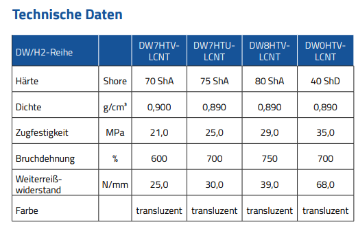 - Die Compounds der DW/H2-Reihe für den Einsatz in Trinkwasserschläuchen weisen eine Verbesserung der mechanischen Eigenschaften von bis zu 50 % im Vergleich zu der vorhergehenden Schlauchserie auf. Mit ihrem herausragenden Knickverhalten und der glatten gleichmässigen Oberfläche stellen sie eine zukunftsorientierte Alternative zu PVC dar.